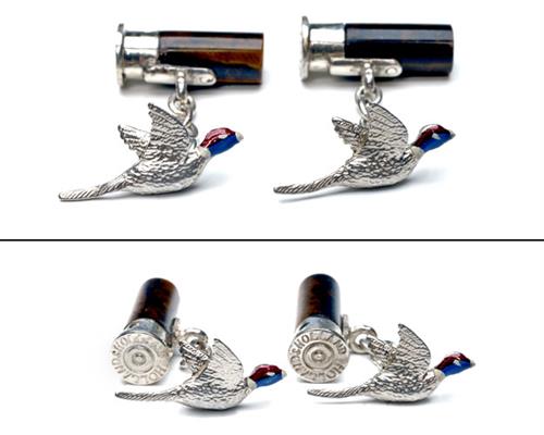 A PAIR OF STERLING SILVER AND TIGER'S EYE 'CARTRIDGE & PHEASANT' CUFFLINKS,