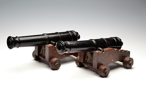 A PAIR OF INERT 1/4 SCALE MODEL CANNON, in the style of 12pdr naval guns, with 15 1/2in. black-painted banded un-bored barrels including the cascabel, moulded trunnions and each complete with its wood naval style trolley on four trucks (clamps missing)