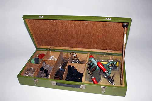 A WOODEN BOX CONTAINING VARIOUS SHOTGUN CARTRIDGE RELOADING TOOLS, including capper/de-capper, roll turn-over tool, powder measure, fibre wads, wad punch, percussion caps