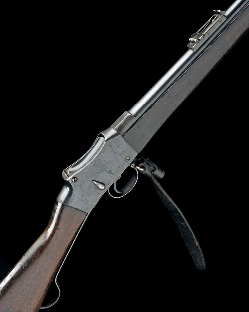 dated for 1887, with blued 33in. barrel, ramp and blade fore-sight, elevating ladder rear-sight, plain blued receiver with maker and model details together with a crown over 'VR' device, tear-drop cocking indicator, walnut butt-stock with iron heel-plate, long under-lever, three-quarter walnut fore-end with two iron barrel-bands, the front with bayonet lug, under-barrel iron clearing rod and original leather sling