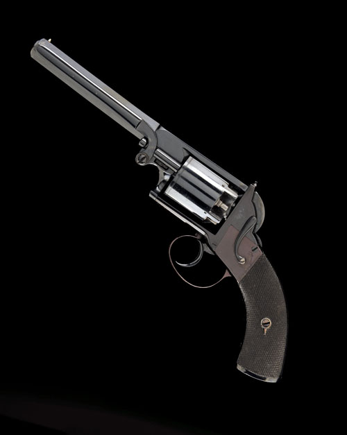 circa 1852, with re-blued octagonal 5 3/4in. barrel, bead fore-sight, borderline engraved two-piece frame with standing notch rear-sight, the right hand side signed 'LONDON PATENT' together with the possible serial number above (badly rubbed with pitting under the finish), plain cylinder with engraved band to leading edge, spurless hammer, swept chequered walnut grips, iron trigger-guard bow and two-piece articulated rammer mounted to the left hand side of barrel, the whole re-blued to a high standard