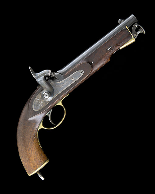 dated for 1871, with blued round 8in. barrel, applied crescent blade fore-sight, standing notch rear-sight to the breech together with various ordnance stamps, plain colour-hardened lockplate signed 'BIRMINGHAM' above the date, the tail stamped with a Queens crown over 'EIG' and a broad arrow, plain walnut full-stock stamped 'B. WOODWARD & SONS' opposite the lock together with a large circular stamp containing the name 'BIRMINGHAM' with a crown above surrounding a broad arrow over 'EIG', brass furniture, iron lanyard ring to heel, brass fore-end cap with integral flared ramrod pipe and iron captive stirrup ramrod, much original finish throughout