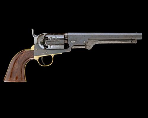 circa 1865, with blued 7 1/2in. barrel signed 'COLT BREVETE', blued plain cylinder with deeply roll-engraved riders on horseback scene and Belgian proofs, colour-hardened open iron frame, brass trigger-guard and grip-straps, smooth walnut one-piece grip and hinged under-barrel rammer, the whole retaining much original finish throughout