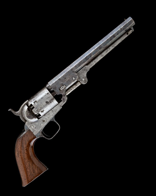 for 1856, with 7 1/2in. blued octagonal barrel, the top-flat signed 'ADDRESS COL COLT LONDON', London proofs, plain cylinder with roll engraved scene, open iron colour-hardened frame with blued dome-headed screws, blued iron back-strap and round-backed trigger-guard, smooth walnut one-piece grip with faint service stampings for Lower Canada on the left hand side and hinged under-barrel rammer, the whole retaining much original but faded finish