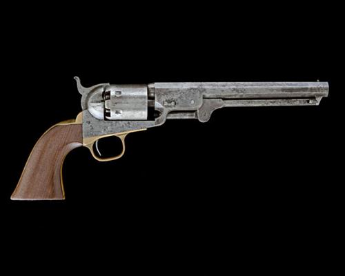 for 1866, with octagonal 7 1/2in. barrel, the breech end signed 'ADDRESS COL SAML. COLT NEW-YORK U.S. AMERICA', London proofs, plain cylinder with roll-engraved scene (cleaned, some pitting), open iron frame, brass trigger-guard and grip-straps, smooth walnut one-piece grip stamped with the 'Enfield' roundel and articulated under-barrel loading lever, minimal traces of finish remaining