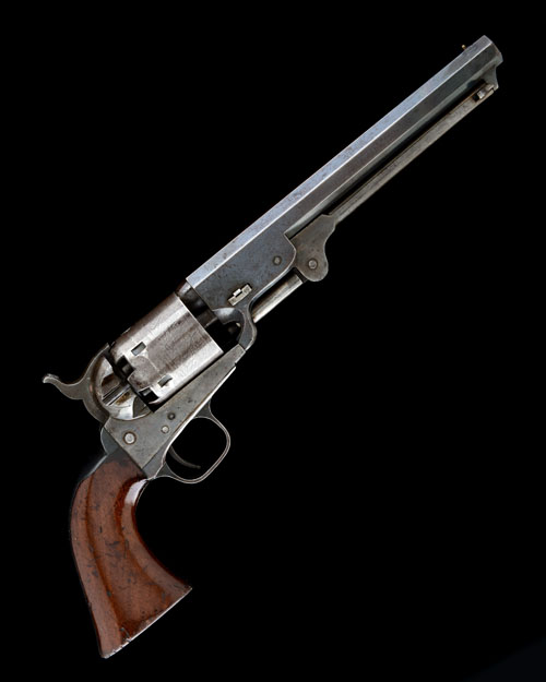 for 1866, with 7 1/2in. blued octagonal barrel, the top-flat signed 'ADDRESS COL SAML COLT NEW-YORK US AMERICA', plain cylinder with roll engraved scene (finish faded), open iron colour-hardened frame with shoulder-stock notches, blued iron back-strap and round-backed trigger-guard, shoulder-stock notch to heel, smooth walnut one-piece grip and hinged under-barrel rammer, the whole retaining much original colour and finish,