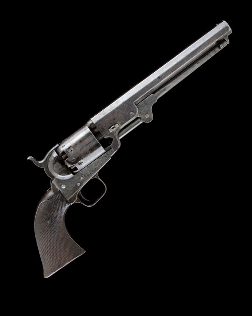 for 1856, with 7 1/2in. octagonal barrel, the top-flat signed 'ADDRESS COL COLT LONDON', London proofs, plain cylinder with roll engraved scene, open iron frame, iron back-strap and round-backed trigger-guard, chequered walnut one-piece grip and hinged under-barrel rammer, the whole retaining traces of original faded finish and colour, COMPLETE WITH its manufacturers oak case, compartmented and lined in burgundy velvet (faded), Colt's instruction label to inside of lid and including an 'L' shaped nipple key, iron ball and bullet mould, large bag-shaped powder flask marked 'COLT'S NAVY FLASK' and signed 'Dixon & Son, Sheffield', an Eley Bros. cap tin and an original cleaning rod