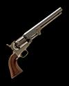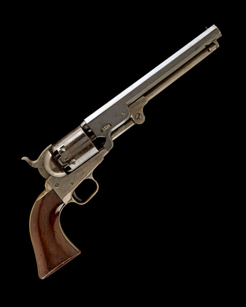 for 1853, with 7 1/2in. blued octagonal barrel, the top-flat signed 'ADDRESS COL COLT LONDON', London proofs, plain cylinder with roll engraved scene, open iron colour-hardened frame, silver plated brass back-strap and round-backed trigger-guard, smooth walnut one-piece grip and hinged under-barrel rammer, the whole retaining a remarkable amount of original finish, COMPLETE WITH its manufacturers mahogany case, compartmented and lined in green velvet, Colt's instruction label to inside of lid and including an 'L' shaped nipple key, brass ball and bullet mould, large bag-shaped powder flask marked 'COLTS NAVY FLASK' and signed 'James Dixon & Son, Sheffield', an Eley Bros. cap tin and a nickel-plated oil bottle