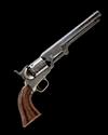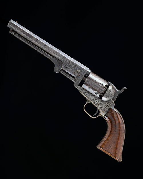 for 1853, with 7 1/2in. octagonal barrel, the top-flat signed 'ADDRESS SAML COLT NEW-YORK CITY', scroll engraved at muzzle, border and scroll engraving at breech, London proofs, plain cylinder with roll engraved scene, open iron colour-hardened frame with scroll engraving, border and scroll engraved silver plated brass back-strap and round-backed trigger-guard, smooth walnut one-piece grip, engraved hinged under-barrel rammer, the whole with strong traces of finish, COMPLETE WITH a period oak case, compartmented and lined in maroon velvet (faded) and including an 'L' shaped nipple key, iron ball and bullet mould, Eley cap-tin, an oil-bottle and a small bag-shaped powder flask signed 'James Dixon & Son Sheffield', model 'FIREPROOF'