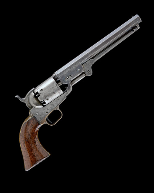for 1853, with 7 1/2in. octagonal barrel, the top-flat signed in script 'ADDRESS COL COLT LONDON', London proofs, plain cylinder with roll engraved scene, open iron colour-hardened frame, silver plated brass back-strap and round-backed trigger-guard, smooth walnut one-piece grip, hinged under-barrel rammer, traces of finish in sheltered areas, COMPLETE WITH its manufacturers oak case, compartmented and lined in blue baize, 'Colt's' instruction label to inside of lid also marked 'SALE OF CONDEMNED STORES BY SEALED PROPOSALS' and including an 'L' shaped nipple key, iron ball and bullet mould, Eley cap-tin and a large bag-shaped powder flask signed 'Sykes Patent.', the outside of case stamped near lock 'S. ISAAC CAMPBELL & CO' within a bordered cartouche