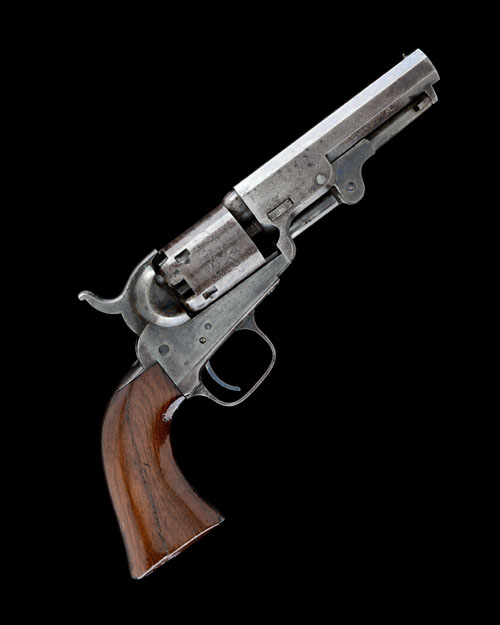 for 1854, with octagonal 4in. barrel (traces of finish remaining), the breech end signed 'ADDRESS COL. COLT LONDON', London proofs, plain cylinder with roll-engraved scene, open colour-hardened iron frame (strong traces of colour), blued iron trigger-guard and grip-straps, smooth walnut one-piece grip stamped with a large British ordnance 'crow's foot' arrow on the left, the right hand side with longitudinal split and articulated under-barrel loading lever, COMPLETE WITH its original makers mahogany storage case compartmented and lined in blue velvet with a parchment instruction label to the inside of the lid and a full complement of accessories including a bag-shaped powder flask marked 'COLT'S POCKET FLASK' and signed James Dixon, Sheffield (spring at fault), a cap-tin, an 'L' shaped nipple-key, a steel cleaning rod and an iron ball and bullet mould