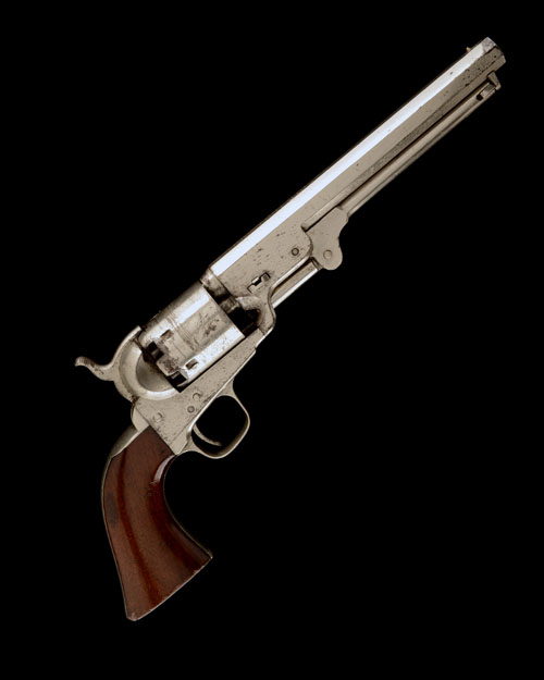 for 1859, with 7 1/2in. octagonal barrel probably re-plated in antiquity by the factory, the top-flat signed 'ADDRESS SAM COLT LONDON', London proofs, plain cylinder with roll engraved scene, open iron colour-hardened frame, plated brass back-strap and round-backed trigger-guard, smooth walnut one-piece grip and hinged under-barrel rammer, the whole retaining much plated finish with some frosting,