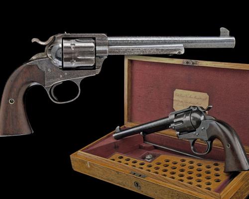 for 1898, with blued London proved 7 1/2in. barrel signed on one line 'COLT'S PT FA MFG CO HARTFORD CT USA', block and blade fore-sight, flat top-strap with drift adjustable notch rear-sight, fluted cylinder, iron frame, blued grip-straps and trigger-guard bow, ribbed trigger, smooth walnut two piece grips, the whole retaining strong traces of original finish TOGETHER WITH its makers London Agency oak storage case compartmented and lined in red baize (faded), the inside of lid with clipped corner parchment trade label marked 'COLT'S PATENT FIRE ARMS MANUFACTURING CO. 26 GLASSHOUSE STREET, PICCADILLY CIRCUS, LONDON W.', and containing an oil bottle, brass cleaning rod, 'L' shaped turn-screw and the case-key, together with provision for 48 individual rounds of ammunition, the outer lid with vacant brass circular escutcheon