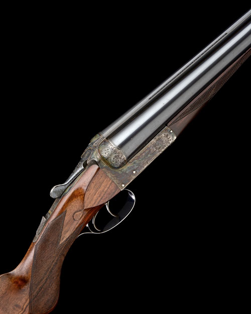32in. nitro barrels with engraved with a beaded band at the breech end, matt rib engraved 'G.E. LEWIS & SONS. 32 & 33 LOWER LOVEDAY ST. BIRMINGHAM.', 3in. chambers, bored approx. 3/4 choke in both, treble-grip action with sideclips, automatic safety with gold-inlaid 'SAFE' detail, the fences engraved with acanthus scrollwork set against a matt background, the action with beaded borderwork and engraved with a brace of ducks alighting from a wetland setting on each side, the underside engraved with the portrait of a hound retrieving fallen fowl, retaining virtually full original colour-hardening and finish, 14 1/4in. semi-pistolgrip stock including 1/2in. rubber recoil pad, weight 8lb., in its makers canvas and leather case