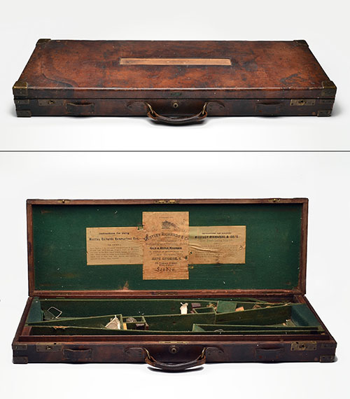 fitted for 30in. barrels, the interior lined with green baize, central brass push-button lock (key missing), two brass clasps, the lid interior with a WESTLEY RICHARDS & CO.' trade label
