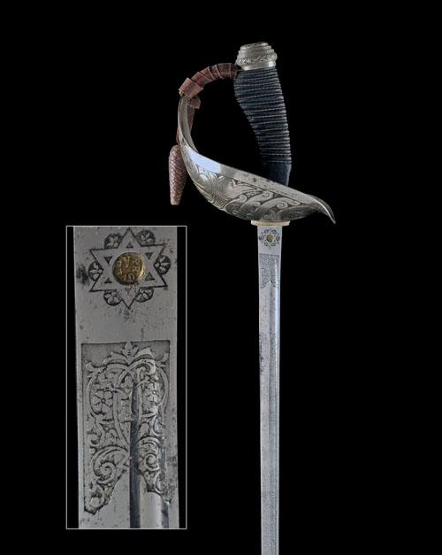 circa 1915, with narrow thrusting fullered 35in. blade etched for the first half of its length with scrolls and arabesques surrounding King George V's crown and cypher, nickel-plated three-quarter basket hilt engraved with flowing scrolls and 'honeysuckle' motifs, shagreen covered semi-pistol grip with wire binding, carved and engraved pommel COMPLETE WITH its leather field scabbard with nickel mounts and a leather sword-knot