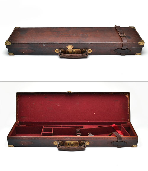 fitted for 28in. barrels, the interior lined with maroon baize (some slight moth damage), brass lock (key missing)
