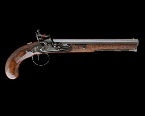 A 28-BORE FLINTLOCK SINGLE-SHOT DUELLING PISTOL, no visible serial number,