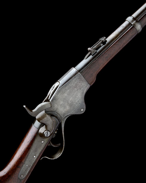 circa 1866, with 20in. sighted round barrel with elevating, folding 'ladder' rear-sight, stamped near 'M1865', top of breech-block inscribed 'SPENCER REPEATING RIFLE CO. BOSTON MASS PAT/D MARCH 6 1860' (faint), no cut-off, saddle ring to left hand side, walnut stock and fore-end, steel butt-plate with aperture for removable magazine (present), steel sling swivel and barrel band