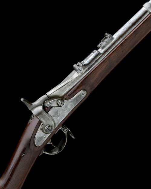 dated for 1866, with round 36 1/2in. barrel, block and blade fore-sight, folding rear-sight, flip-open breech-block with side release catch, the top of block stamped '1866' with an eagles head, bar-action lock with bevel-edges signed 'US' over 'SPRINGFIELD' and marked with an American eagle and dated '1865' at the tail, walnut straight-hand three-quarter stock, iron furniture and under-barrel iron clearing rod