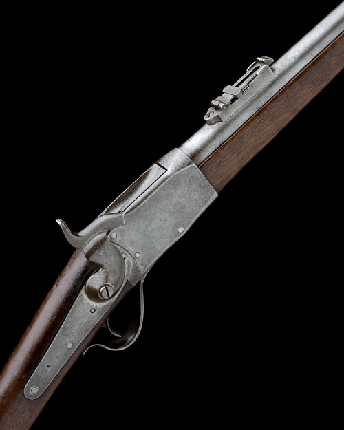 French contract circa 1870, with 21 1/2in. barrel, German proofs, block and blade fore-sight, ladder rear-sight, plain action, the left hand side signed 'PEABODY'S PATENT JULY 22 1862, MAN'F'D BY PROVIDENCE TOOL CO. PROV. R.I.', back-action lock with external hammer, walnut straight-hand butt-stock, iron butt-plate, iron under-lever, walnut three-quarter length fore-end with iron barrel-band, bayonet bar to muzzle and iron under-barrel clearing rod