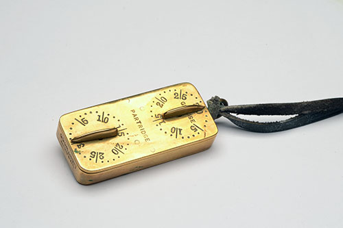 brass construction, each face with two ratcheted dials marked for 'GROUSE', PARTRIDGE', 'HARES' and 'PHEASANTS', with leather lanyard