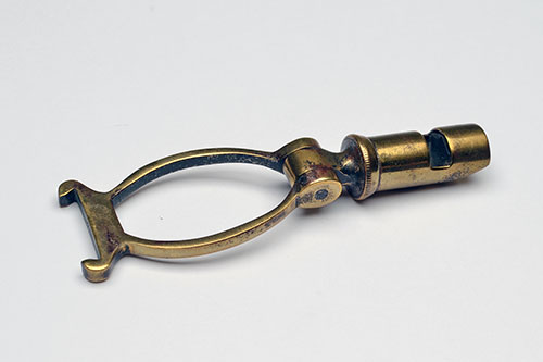 A BRASS-FINISH HINGED COMBINATION 12-BORE CARTRIDGE EXTRACTOR / WHISTLE