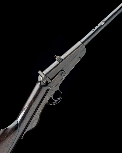 circa 1908, with two stage 20 1/2in. barrel, replacement dove-tailed front and adjustable rear-sights (utilising new dove-tails), the top-flat signed 'COX'S PATENT', the side of breech stamped 'THE BRITANNIA' surrounding a seated figure of Britannia bisecting the legend 'REGD TRADE MARK', stirrup barrel locking latch, slanted air-chamber with applied walnut comb, cocking link housing the trigger-unit stamped 'RD394207', the whole re-finished in antiquity, now stained