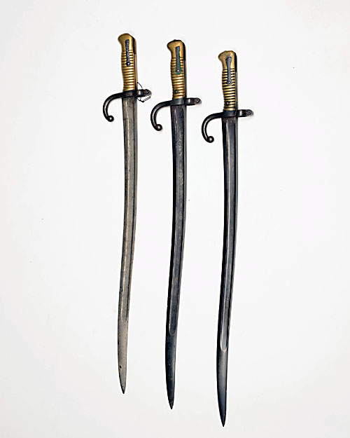 THREE FRENCH CHASSEPOT-TYPE YATAGHAN BAYONETS, serial no's. 11721, AC48737 & C57763, no scabbards, some muzzle-ringed for Gras rifles