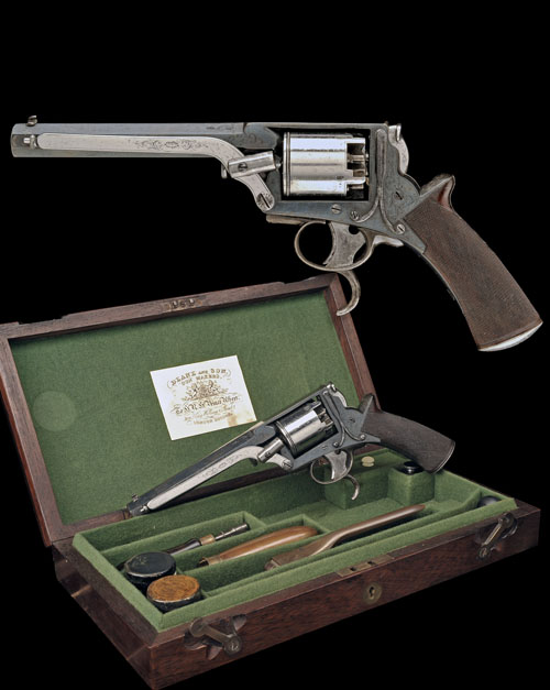 second model circa 1856, with re-blued 6in. barrel, dove-tailed blade fore-sight, standing notch rear-sight to rear of top-strap, the top-strap signed 'DEANE & SON 30 KING WILLIAM ST LONDON BRIDGE', plain cylinder with rope-edge border to front and borderline engraving to rear, borderline and scroll engraving to frame, spur-less hammer, 'Y' shaped spring safety, one-piece chequered walnut grip, scroll engraved iron butt-cap, 'Kerr-style' iron rammer, stamped 'TRANTERS PATENT' in an oval to side of the patent double-trigger, brushed bright and re-blued finish throughout TOGETHER WITH a renovated mahogany storage case with an original mould and a number of reproduction accessories