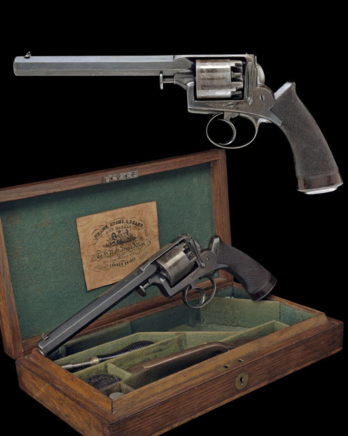circa 1853, with octagonal 6 1/4in. barrel, radiused muzzle, dove-tailed blade fore-sight, standing notch rear-sight, the top-strap signed 'DEANE ADAMS & DEANE 30 KING WILLIAM ST LONDON BRIDGE', borderline and scroll engraved iron frame, plain cylinder, chequered walnut one-piece grip, iron butt-cap, spurless hammer and no provision for rammer COMPLETE WITH a period oak storage case compartmented and lined in green baize, reproduction trade label to inside of lid and containing a number of original accessories including a flask, bronze bullet-mould, cap-tin, oil-bottle and nipple-key