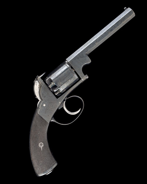 circa 1852, with re-blued octagonal 5in. barrel, bead fore-sight, borderline and scroll engraved open frame with standing notch rear-sight, plain cylinder with engraved band to leading edge, spurless hammer, swept chequered walnut grips, iron trigger-guard bow and two-piece articulated 'Kerr-type' rammer mounted to the left hand side of barrel, the whole re-finished