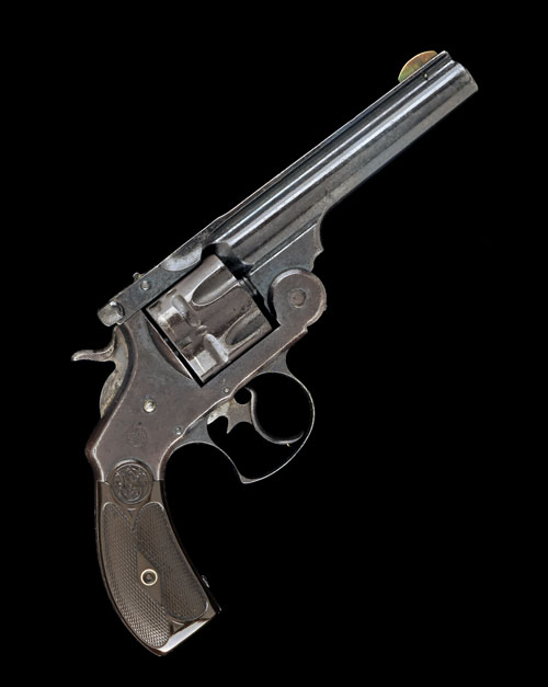 circa 1889, with 5in. sighted barrel, raised top-rib signed by the makers with patent dates to 1880, fluted cylinder, break-open frame with automatic ejection mechanism, chequered hard-rubber grips embossed with the Smith & Wesson trademark, small traces of original finish in sheltered areas, the remainder darkly stained