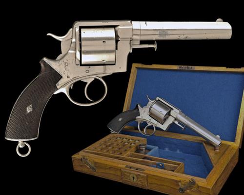 circa 1878, with ovoid nickel-plated 6in. barrel, crescent fore-sight, sighting groove to the top-strap, nickel-plated frame, plain cylinder with forward locking notches, spurred hammer, chequered walnut grips, lanyard ring to heel and swinging centrally stored ejector rod with barrel-mounted crane, the whole probably re-nickeled and with areas of polished pitting TOGETHER WITH a competently made later oak storage-case, compartmented and lined in blue baize and containing a period turn-screw, oil bottle and cleaning rod and complete with 6 rounds of dummy .500 boxer cartridges