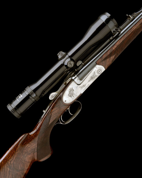 cat. no. 8506, 23 5/8in. Bohler super blitz steel nitro barrels with raised sight rib, open sights and ramp-mounted bead fore-sight, the breech end mounted with a Zeiss Diavari-ZM 1,5-6x42 T* telescopic sight in quickly-detachable mounts, 3in. shot chamber, bored approx. 1/4 choke, side-bolstered treble-grip action with removable striker discs, manual safety with integral shot / ball selector switch, set front trigger, bright finish action and decorative sideplates with best bold acanthus scroll detailing, the left side with a finely engraved scene of wolf and bear, the right with a moose and the underside with a capercaillie, signed 'Severin', the triggerguard carved with the monogram 'MM' in a cartouche, 15in. very highly-figured pistolgrip stock with cheekpiece, horn pistolgrip-cap, sling swivels and including 5/8in. leather covered recoil pad, fore-end with Deeley & Edge patent release catch, weight 8lb. 8oz., in a soft leather leg of mutton case