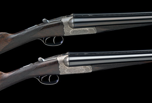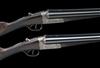 28in. Westley Richards special-steel nitro reproved barrels (in 2014), ribs re-engraved 'WESTLEY RICHARDS 23 CONDUIT ST. LONDON. GUN MAKERS BY APPOINTMENT TO HM THE KING.', and gold-inlaid '1' and '2', 2 1/2in. chambers, bored approx. true cyl. and imp. cyl. choke, scroll-back treble-grip actions incorporating J. Deeley and L.B. Taylor patent hand-detachable locks, patent no. 17731 of 28th July 1897 with improved 'lighter pull-off' modification, patent no. 10567 of 7th May 1907, use numbers 3341 and 3342, toplevers engraved 'WESTLEY RICHARDS EJECTOR' and gold-inlaid '1' and '2', automatic safeties with gold-inlaid 'SAFE' details, hinged floorplates, profusely engraved with bold acanthus scrollwork, the triggerguards with a pointer (No.1) and a setter (No.2) on the scent, brushed finish overall, 14 3/4in. well-figured stocks including 1in. rubber recoil pads, fore-ends with Deeley & Edge patent release catches and with horn finials, weight 6lb. 7oz., in their brass-cornered leather bound oak case