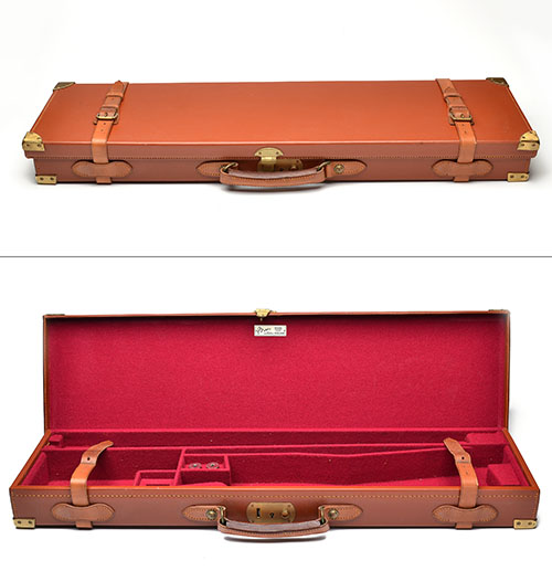 fited for 28in. or 30in. barrels, the interior lined with maroon baize, brass lock (key missing), including two nickel-plated 12-bore snap-caps