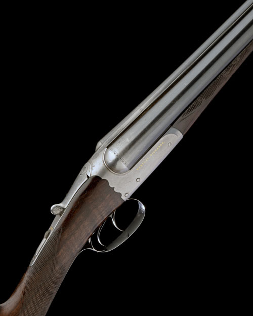 28in. replacement nitro barrels (circa 1973, barrel loop signed 'A. SMITH'), 2 3/4in. chambers, bored approx. 1/4 and 3/4 choke, treble-grip scroll-back action, Westley Richards patent toplever, engraved 'WESTLEY RICHARDS PATENT EJECTOR', automatic safety with gold-inlaid 'SAFE' detail, plain bright finish with the makers name inlaid in gold, 14 1/4in. figured stock including 7/8in. rubber recoil pad, fore-end with Deeley & Edge patent release catch, horn finial, minor insert repair, weight 6lb. 8oz.