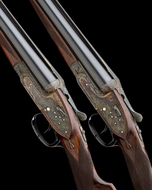 25in. nitro chopperlump barrels with matt Churchill-ribs, 2 3/4in. chambers, bored approx. 1/4 and 1/2 choke, removable striker discs, automatic safeties, hand-detachable lockplates, gold-inlaid cocking-indicators, articulated front triggers, rolled-edge triggerguards, fully engraved with acanthus scroll and floral motifs, retaining virtually full original colour-hardening and finish, 14 5/8in. stocks, weight 6lb. 4oz., in a Brady lightweight leather motor case
