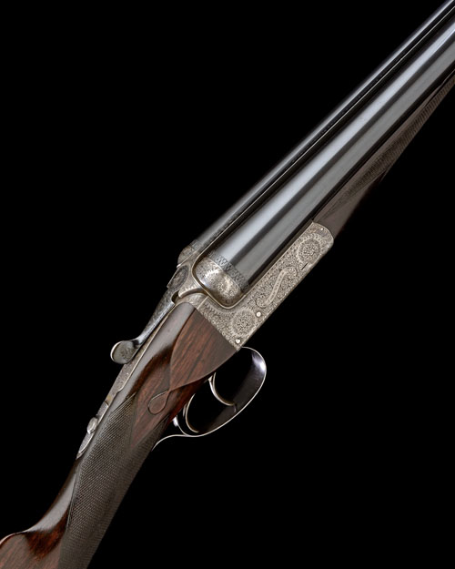 28in. nitro chopperlump barrels, rib engraved 'JOHN WILKES. 79 BEAK STREET. REGENT STREET. LONDON. W.', 2 1/2in. chambers, bored approx. imp. cyl. and 3/4 choke, carved fences, automatic safety with gold-inlaid 'SAFE' detail, best fine floral bouquet and acanthus scroll engraving, the makers name in a scrolling banner, retaining traces of original colour-hardening and some original finish, 15 1/8in. boldly-figured stock including 1 1/8in. wooden extension, weight 6lb. 9oz., in a brass-cornered leather case