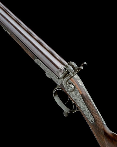 28in. black powder bold damascus barrels, rib re-engraved 'JOSEPH HARKOM 32 PRINCES STREET. EDINBURGH', and deeply carved with filiciform details at the breech ends, slender standing breech, elongated top strap, non-rebounding back action locks with finely carved faceted hammers, bold border and acanthus scroll engraving with game scenes of hound and fowl, the triggerguard with a nye of pheasants, 14in. boldly-figured stock including steel buttplate, chequering refreshed and with insert repair to left overhorn, weight 6lb. 3oz.