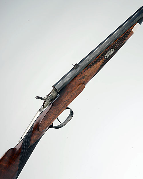 A .430 (C/F) SINGLE-BARRELLED SPORTING-RIFLE, UNSIGNED, serial no. 919, probably Belgian, circa 1880, with sighted octagonal 27in. barrel, hinged breech and central hammer, chequered walnut half-stock with horn tip