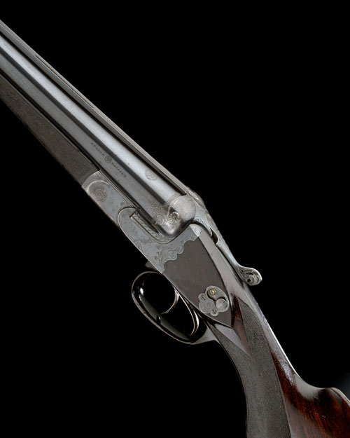 28 3/8in. (72cm) Witten Excelsior-steel black powder only barrels, broad raised finely matted rib with gold bead fore-sight and intermediate bead sight, banner engraved 'STAHL & BERGER. HAMBURG' and with finely engraved feathered bands at the breech ends, the sides engraved 'BURGER MEISTER' and with 'S.B.H.' in a roundel, 2 1/2in. chambers, bored approx. full choke in both, scroll-back multiple bite action with side-bolsters, inverted serpentine side-clips, dolls-head extension and angled Greener type cross bolt, pierced toplever, Greener type manual side-safety, detachable floorplate, detachable locks of J. Deeley and L.B. Taylor 1897 patent type, horn triggerguard (lightly damaged), action engraved with rococo floral designs, 14 5/8in. well-figured semi-pistolgrip stock with lanciform horn drop-points, sling swivels and including 7/8in. rubber recoil pad, fore-end with ornately bordered chequering and Deeley & Edge patent release catch, weight 7lb. 6oz.