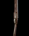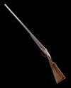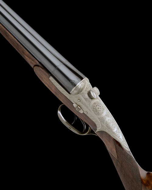 27 5/8in. (70cm) nitro monobloc barrels with sunken matt top rib and no under rib, belemnoid scroll engraving at the breech end, 9 punch marks, 2 3/4in. chambers, bored approx. 1/4 and 1/2 choke, sprung sliding-breech with converging obturator discs, button barrel release, manual side safety, bouquet and scroll engraving with carved leaf fences, bright finish overall, 14 1/2in. figured stock including 3/4in. rubber recoil pad, horn finial, weight 6lb. 2oz.