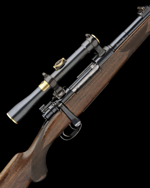 23 7/8in. nitro reproved barrel (in 2011) with block-mounted open sights with folding leaf sight, ramp-mounted bead fore-sight, the receiver (with thumb cutout) mounted with a Karl Kahles Mignon 4x telescopic sight in quickly-detachable mounts, flat bolt handle, floorplate with military style release, set triggers, figured full length pistolgrip stock with cheekpiece, chequered panels at grip and fore-end, horn finial, pistolgrip-cap, sling swivels, 14 1/4in. pull including buttplate