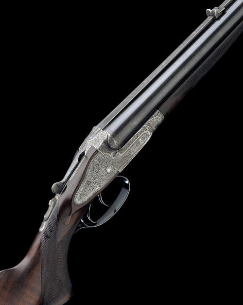 original 26in. black powder only barrels with raised matt rib, carved in gothic script 'JNO. RIGBY & CO. 72 ST. JAMES'S STREET. LONDON AND DUBLIN', open sights and folding leaf sight with white metal inlaid sight lines and marked for 100 and 200 yards, ramped blade fore-sight, tubes engraved 'CASE 400 BORE MAGNUM 110GRS NO. 6 POWDER. CANNELURED BULLET 260GRS.';