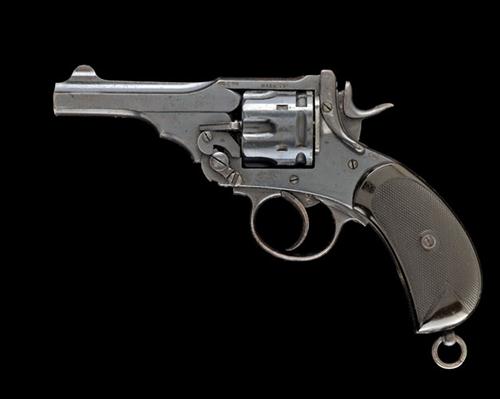 circa 1900, with 4in. sighted barrel, holster-guides, fluted cylinder with broad locking notches, break-open frame, hard-rubber chequered birdshead grips, back-strap marked 'CG' either side of a broad arrow stamp over '363' and lanyard ring at heel, much original finish remaining