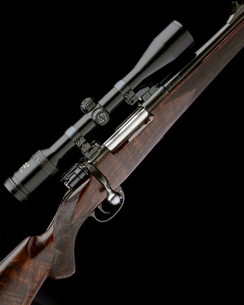 23 1/4in. nitro barrel numbered 087 and engraved 'T. T. PROCTOR (GUNMAKER) LTD WILMSLOW ENGLAND', block mounted open sights, ramp-mounted bead fore-sight, receiver mounted with a Zeiss Diavari V 3-9x42 T* telescopic sight in quickly-detachable mounts, the receiver (with thumb cutout) engraved on the left 'DEUTSCHE WAFFEN-UND MUNITIONSFABRIKEN. BERLIN.', and on the right 'MOD. 1908', hinged floorplate with push button release, highly-figured left-handed pistolgrip stock with cheekpiece, steel pistolgrip-cap, sling swivels, 14 3/8in. pull including 5/8in. rubber recoil pad
