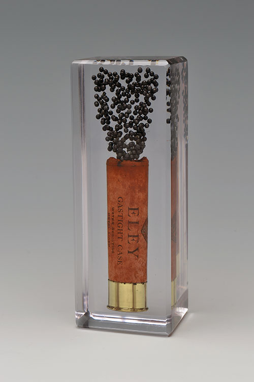 A PAPER-WEIGHT OF AN OPENED 10-BORE ELEY PAPER CARTRIDGE WITH SHOT STRING,