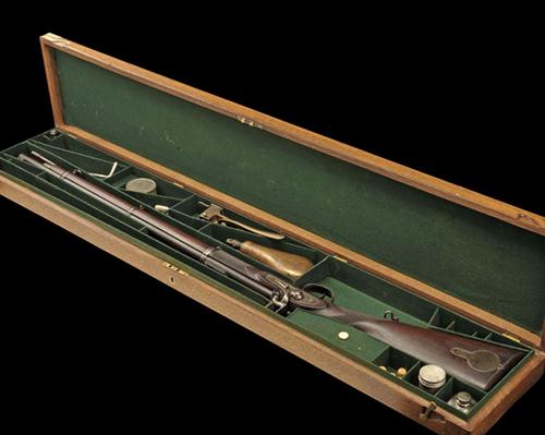 circa 1865, with 33in. sighted barrel marked 'WHITWORTH PATENT' (rubbed, barrel exterior frosted), block for adjustable tunnel fore-sight, elevating ladder rear-sight, border engraved recessed patent breech, base for an aperture vernier-sight fitted behind the barrel tang, border engraved bolted lock signed 'WHITWORTH RIFLE CO. MANCHESTER' and with crowned corn bushel trade mark and the letter 'W' on the tail, figured walnut three-quarter stock with chequered grip and fore-end, border engraved blued iron mounts, iron sling mounts, and iron ramrod, Birmingham proof marks, TOGETHER WITH the manufacturers original oak storage case, compartmented and lined in green baize and containing a number of period and original accessories including a powder-flask, bullet mould, a tin for felt wads, a nickel oil bottle and other sundry cleaning and maintenance items along with the vernier tang-sight and the adjustable tunnel fore-sight